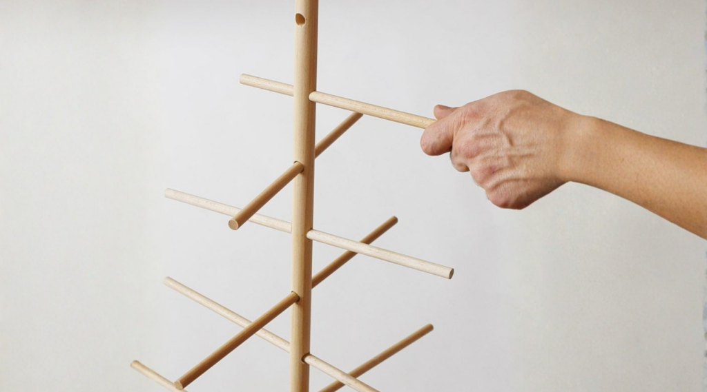 - Na versão Espiral: coloca os listões na haste central, do maior para o menor, rodando ligeiramente para criar o efeito.